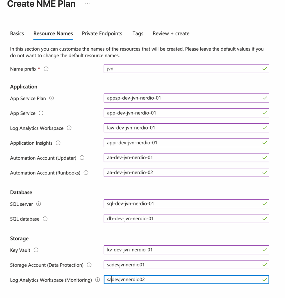 The second tab is the one that is changed the most. Here we now get to choose a name prefix but also custom names for Nerdio resources.